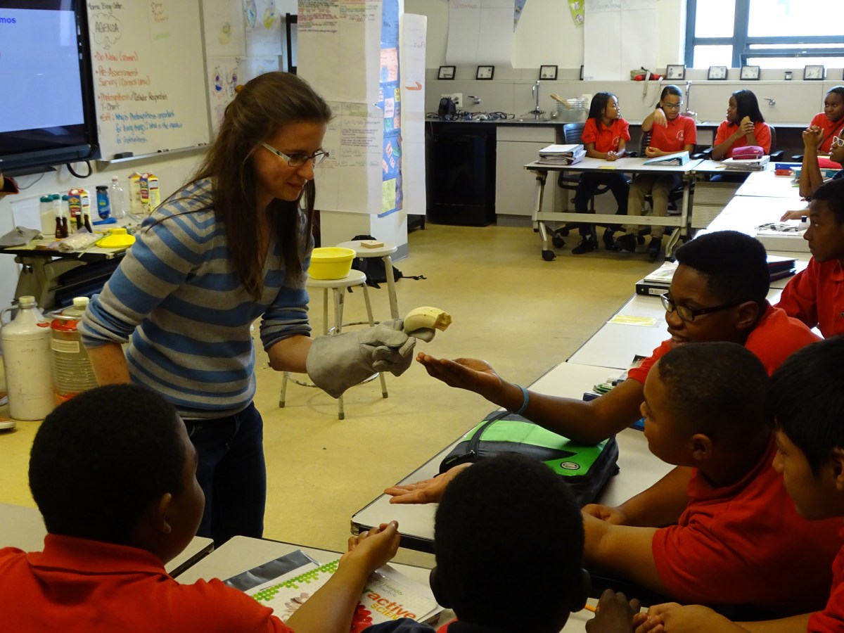 Prof Silberstein showing the fracture surface of a banana dunked in liquid nitrogen